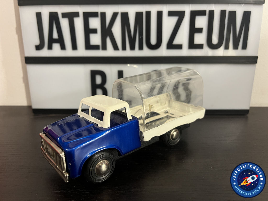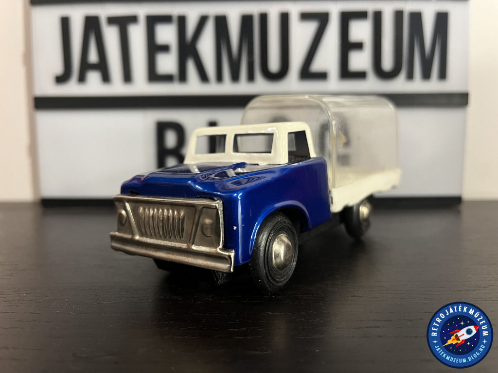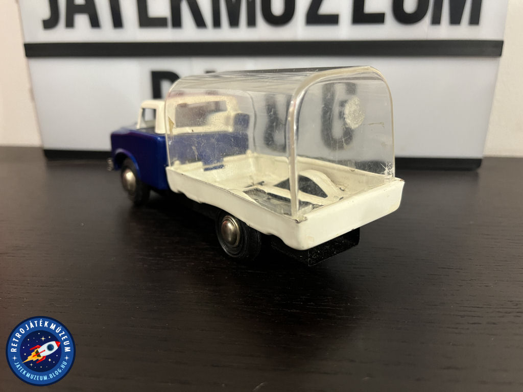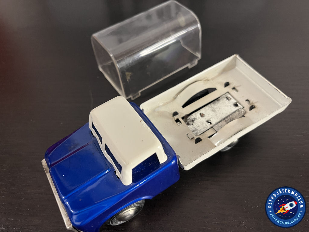 Az egész teherautó fémből készült, amit összesen a platót fedő átlátszó műanyag plexi búra szakít meg.